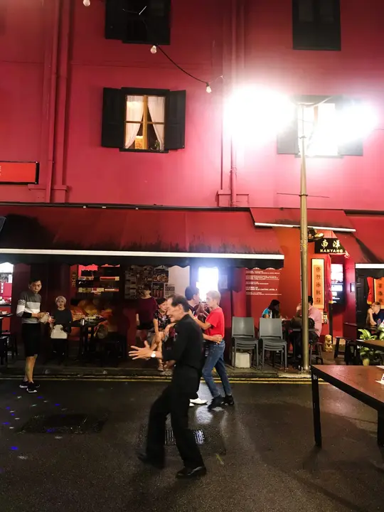 After a sumptuous meal of Hainanese Chicken Rice in Singapore’s Chinatown, we were on our way to the MRT when we came across an impromptu performance by a band. A few couples had started dancing, enjoying the music in the open air. Among them was a gentleman dressed in black, dancing gracefully with a partner. Midway through the song, she left him, called away by something urgent.